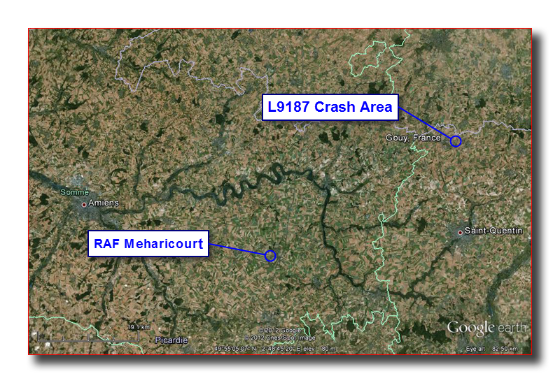 | Commentaires | Décollage de Méharicourt (80) – un autre appareil du même squadron (le L9254) a été abattu, le même jour, 10 km plus au nord à Crèvecoeur-sur-l’Escaut |